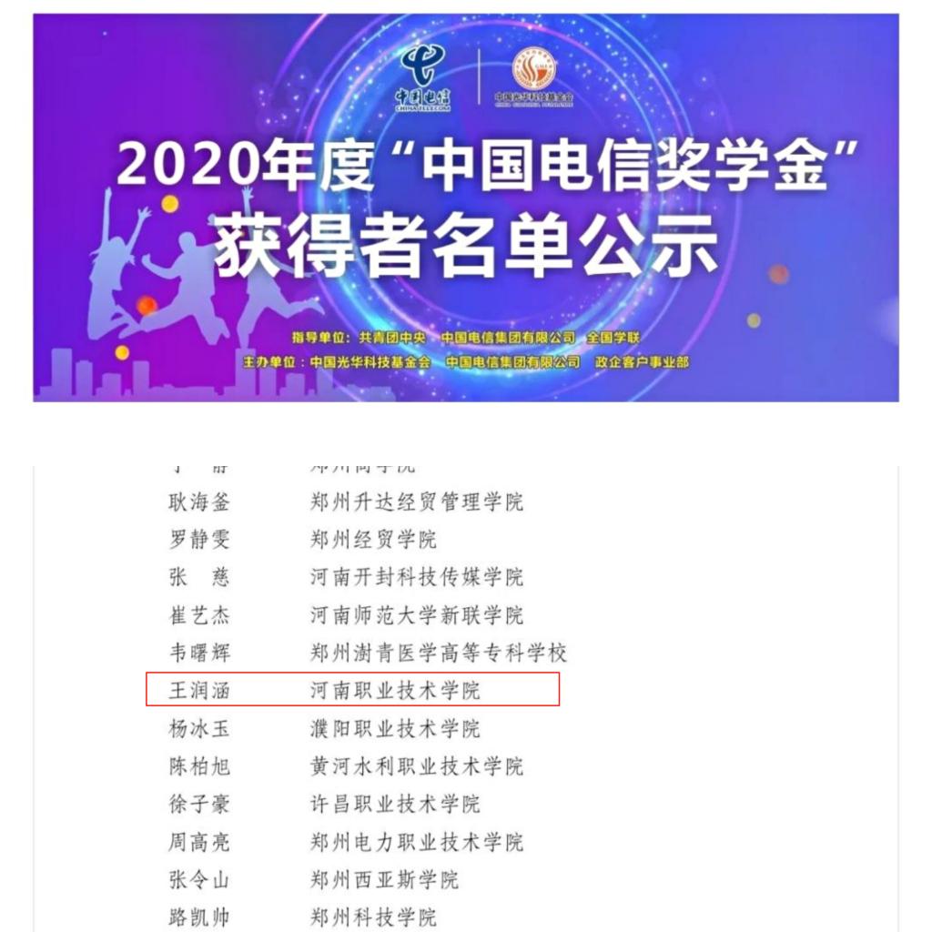 近日,由共青团中央、中国电信集团有限公司、全国学联联合开展2020年度“中国电信奖学金”推报活动名单揭晓,球盟会官网王润涵同学获得“中国电信奖学金•飞Young奖"。