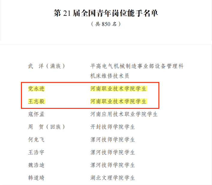 近日,共青团中央、人力资源社会保障部联合开展了第21届全国青年岗位能手评选活动,经择优遴选、严格把关和集中评审,共评选出“全国青年岗位能手标兵”50名、“全国青年岗位能手”850名。球盟会官网党永进、王志毅2名同学入选“全国青年岗位能手”。