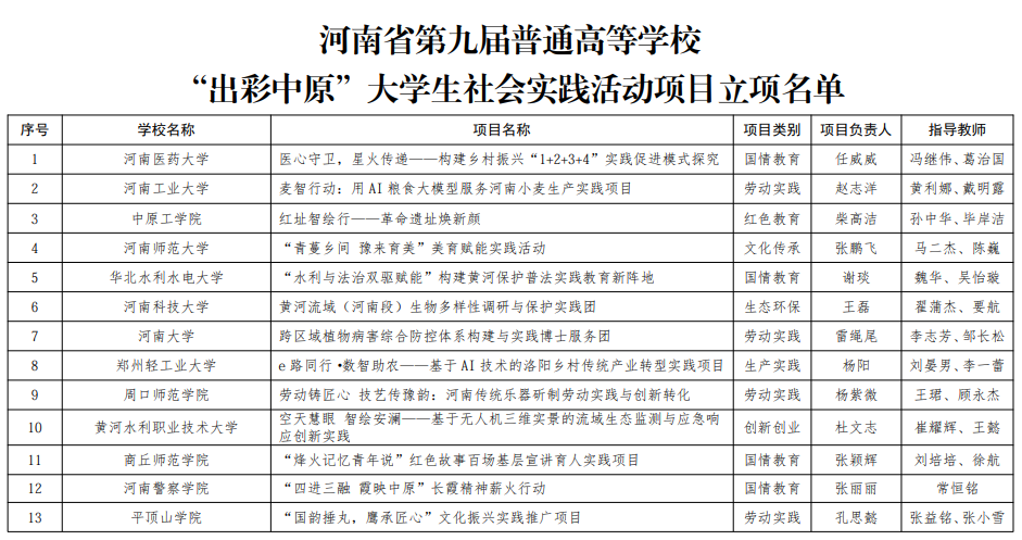 据悉,此次评定共确定140个第九届普通高等学校“出彩中原”大学生社会实践活动立项项目;确定80个第七届普通高等学校“出彩中原”大学生社会实践活动结项项目,并评定出一等奖10项、二等奖20项、三等奖28项。(供稿:靳兵;审稿:王璐)