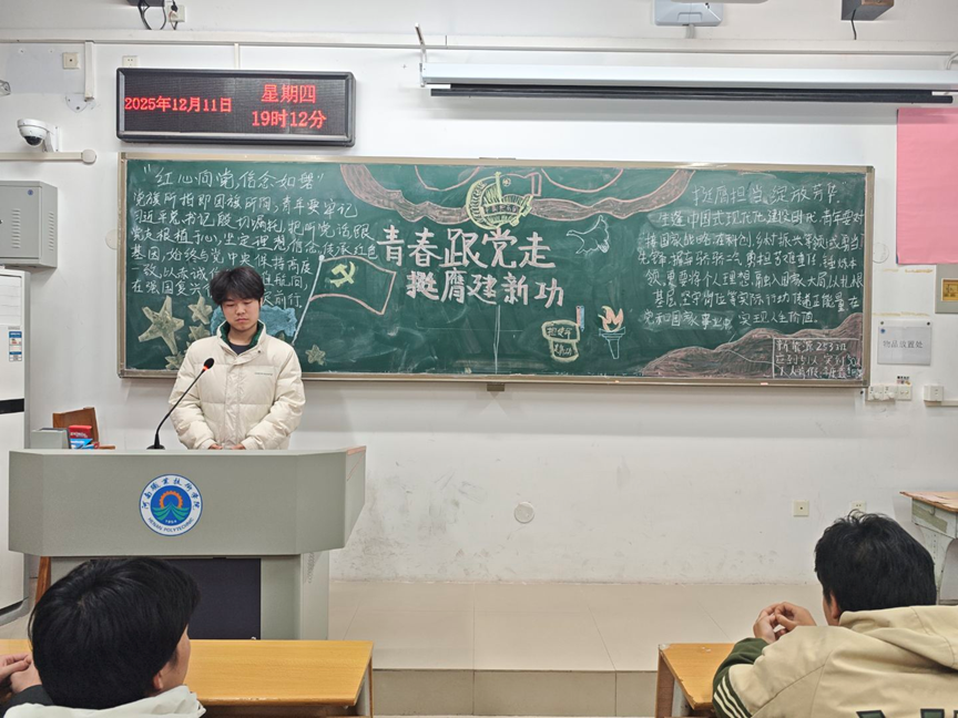 本次团课围绕“以中国式现代化全面推进强国建设、民族复兴伟业,青年大有可为”的核心要求展开,强调青年学生要坚定政治方向,自觉听从党和人民的召唤,深刻领悟“两个确立”的决定性意义,始终“紧跟党走”。团课伊始,各班团支部书记带领同学们重温习近平总书记重要贺信中的殷切嘱托,深入学习党中央致词的精神内涵与实践要求,系统阐述青年一代在推进中国式现代化建设、实现强国建设与民族复兴伟业中的历史方位与责任担当。